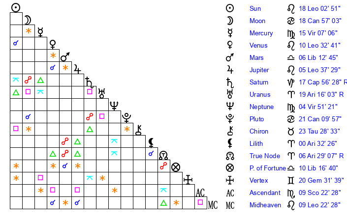 | Jupiter | 5 Leo 28 | 13 Cancer 58 | 21 Leo 20 |