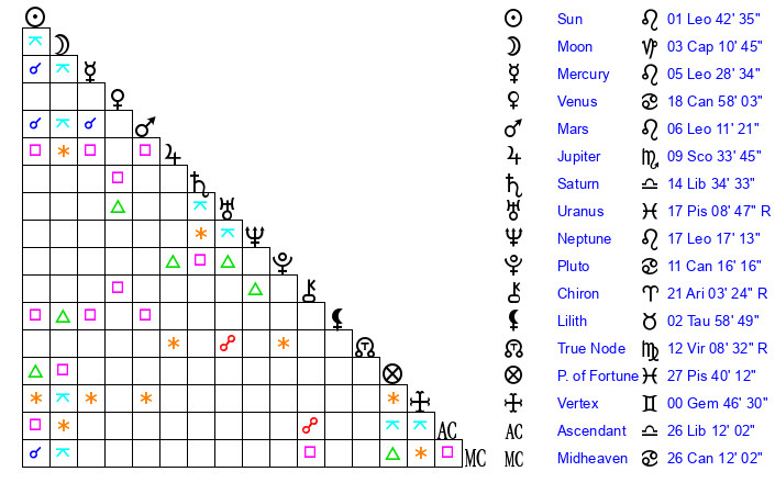 | Moon | 3 Capricorn 7 | 14 Leo 26 | 16 Virgo 40 |