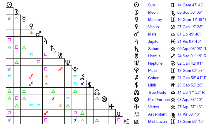 | Sun | 14 Gemini 47 | 16 Gemini 14 | 12 Libra 15 |