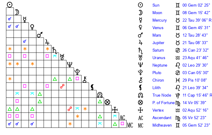 | Venus | 6 Gemini 46 | 15 Aries 27 | 18 Libra 15 |