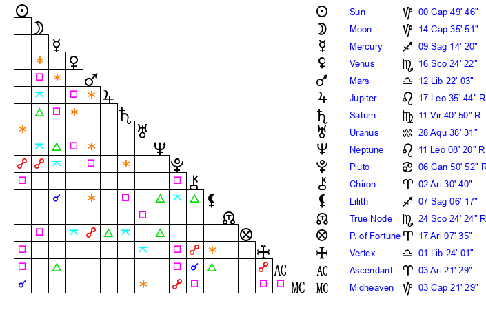 | Sun | 0 Capricorn 49 | 2 Capricorn 22 | 16 Aries 35 |