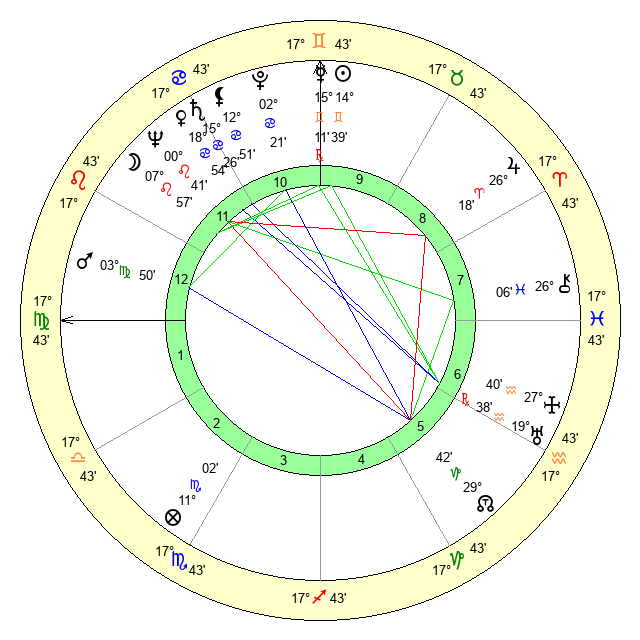 | Sun | 14 Gemini 39 | 15 Gemini 17 | 29 Virgo 20 |