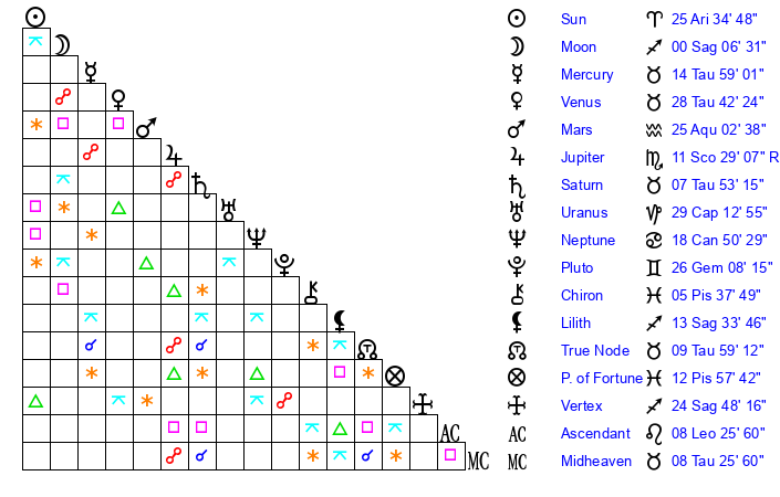 Venus | 28 Taurus 43 | 24 Pisces 54 | 24 Virgo 48 |