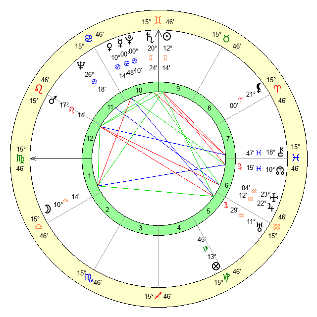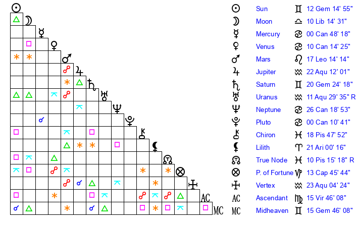 | Sun | 12 Gemini 15 | 13 Gemini 22 | 28 Virgo 50 |