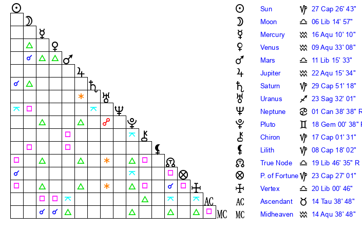 | Mercury | 16 Aquarius 10 | 15 Capricorn 11 | 15 Gemini 54 |