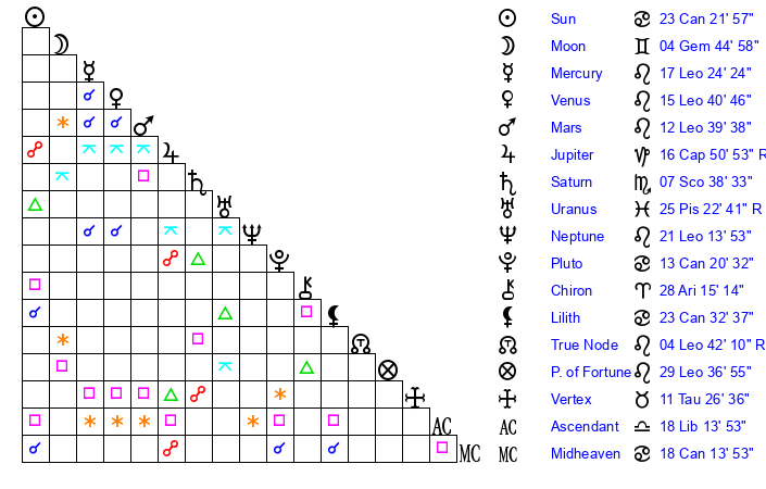 | Neptune | 21 Leo 14 | 2 Aries 8 | 24 Leo 28 |