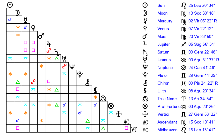 Sun | 25 Leo 20 | 26 Leo 0 | 17 Sagittarius 17 |