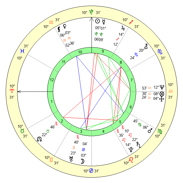 | Moon | 3 Cancer 2 | 28 Scorpio 31 | 25 Aries 2 |