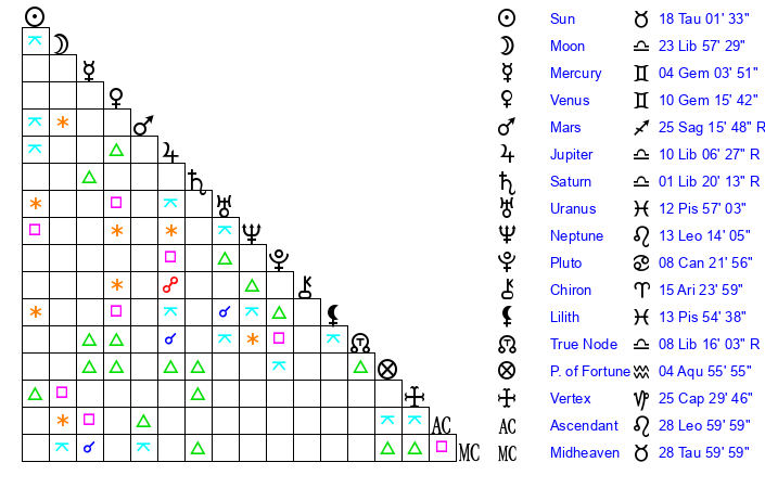 | Sun | 18 Taurus 2 | 19 Taurus 5 | 26 Leo 37 |