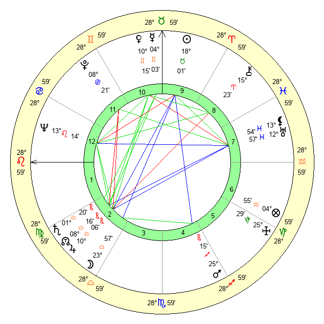 | Saturn | 2 Libra 3 | 28 Pisces 35 | 6 Libra 0 |