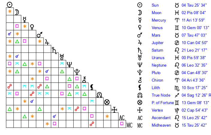 | Neptune | 6 Leo 32 | 0 Aries 55 | 9 Leo 19 |
