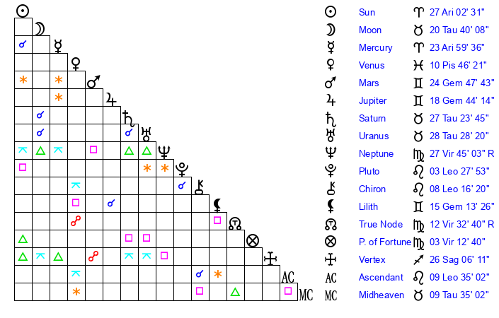 | Moon | 20 Taurus 35 | 19 Sagittarius 7 | 5 Gemini 19 |