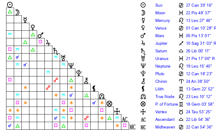 | Pluto | 12 Cancer 18 | 2 Aquarius 41 | 13 Cancer 30 |