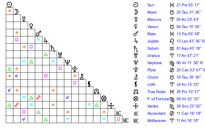 | Sun | 21 Pisces 55 | 22 Pisces 22 | 22 Gemini 26 |