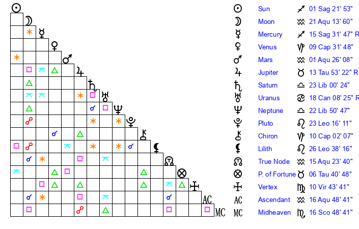 | Sun | 1 Sagittarius 22 | 1 Sagittarius 39 | 15 Aquarius 36 |