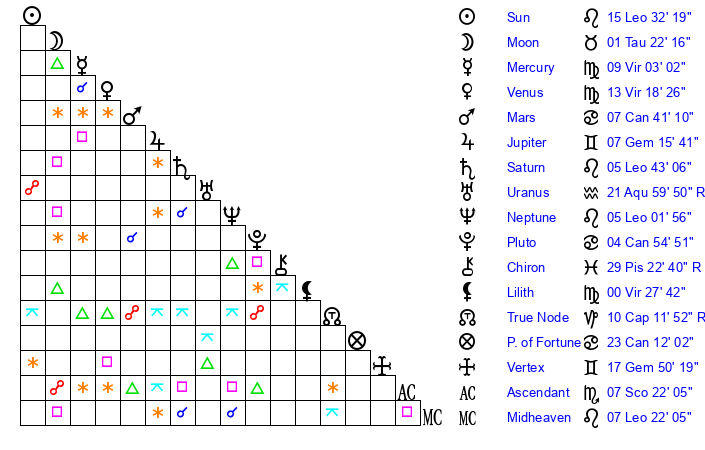 | Sun | 15 Leo 32 | 16 Leo 24 | 1 Sagittarius 51 |