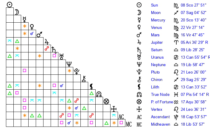 | Neptune | 19 Libra 59 | 29 Pisces 46 | 21 Libra 41 |