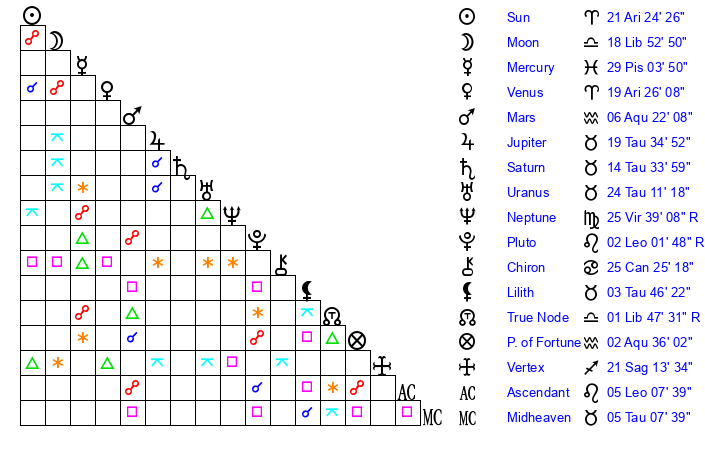 | Sun | 21 Aries 24 | 22 Aries 3 | 12 Cancer 18 |