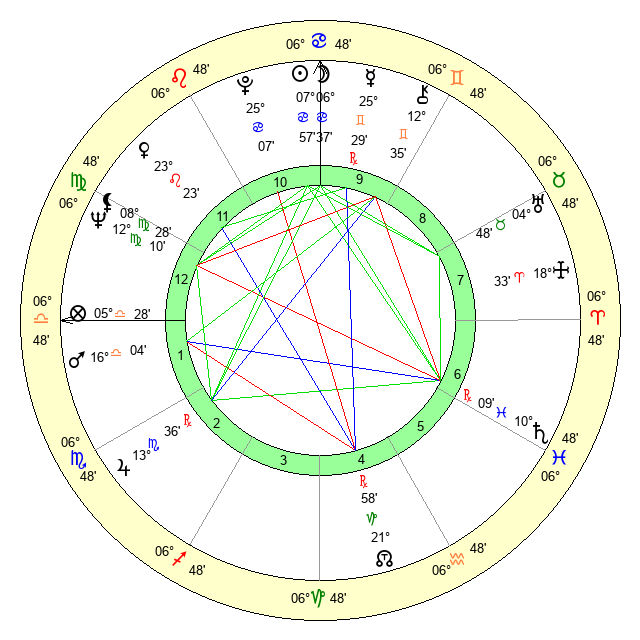 | Moon | 6 Cancer 27 | 15 Virgo 36 | 15 Libra 28 |