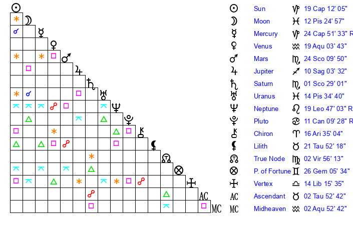 | Sun | 19 Capricorn 12 | 20 Capricorn 42 | 0 Taurus 19 |