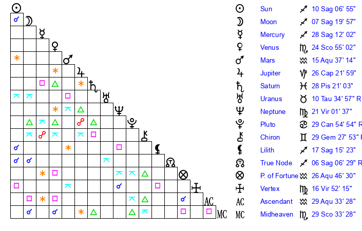 | Sun | 10 Sagittarius 7 | 10 Sagittarius 46 | 9 Pisces 27 |