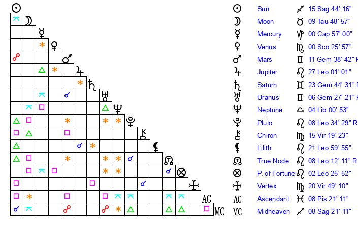 | Moon | 9 Taurus 48 | 8 Leo 12 | 12 Taurus 31 |