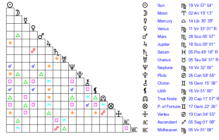 | Sun | 19 Virgo 58 | 21 Virgo 9 | 19 Sagittarius 45 |