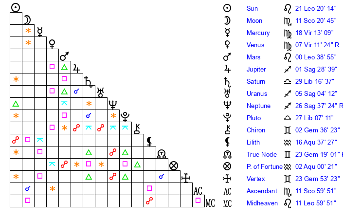 | Mars | 0 Leo 39 | 4 Libra 51 | 27 Leo 19 |