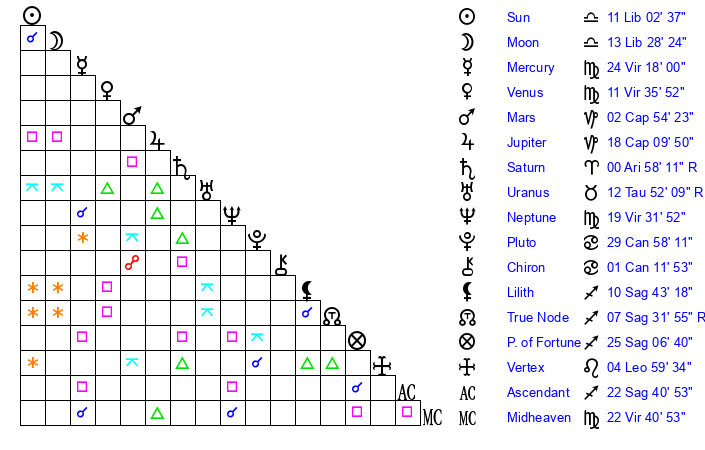 | Moon | 13 Libra 23 | 8 Pisces 37 | 27 Sagittarius 53 |