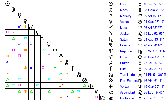| Sun | 16 Taurus 54 | 17 Taurus 23 | 15 Leo 54 |