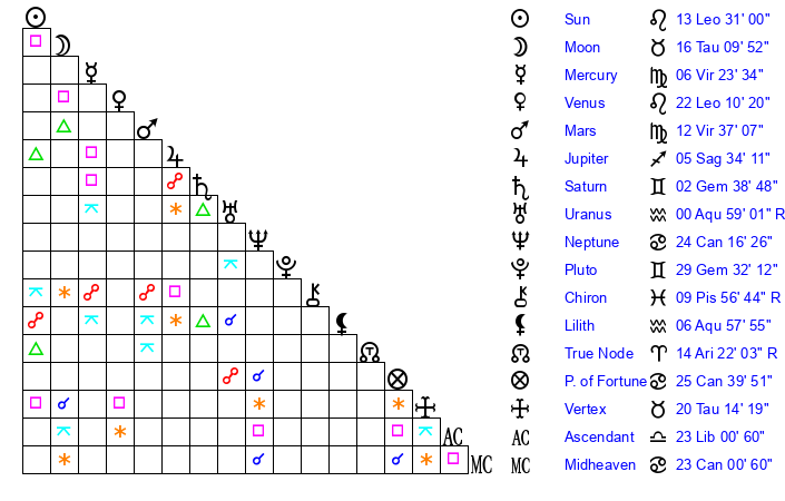 Sun | 13 Leo 31 | 14 Leo 11 | 4 Sagittarius 48 |