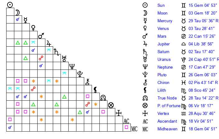 | Pluto | 26 Gemini 6 | 3 Aquarius 34 | 27 Gemini 57 |