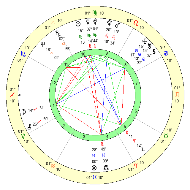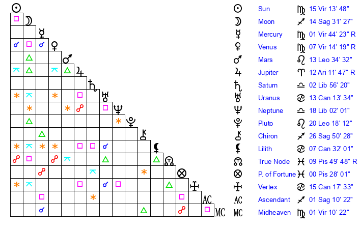 | Sun | 15 Virgo 13 | 16 Virgo 18 | 28 Scorpio 34 |