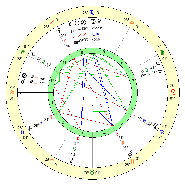 | Moon | 25 Scorpio 28 | 23 Aries 53 | 8 Aquarius 50 |