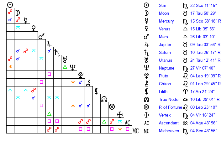 | Venus | 15 Libra 36 | 9 Scorpio 44 | 1 Aquarius 0 |