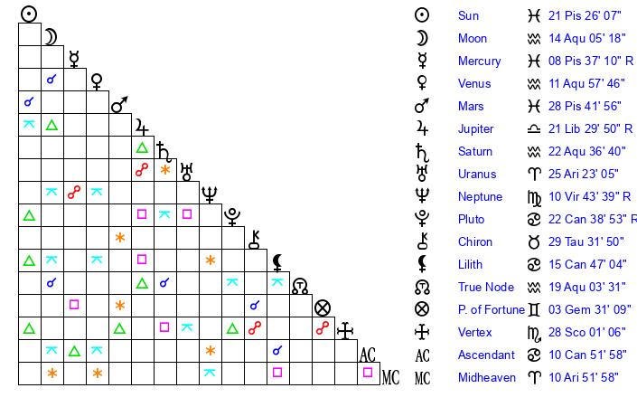 | Sun | 21 Pisces 26 | 22 Pisces 22 | 20 Gemini 3 |