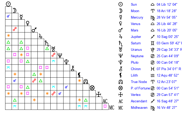 Sun | 4 Libra 12 | 4 Libra 50 | 28 Capricorn 2 |