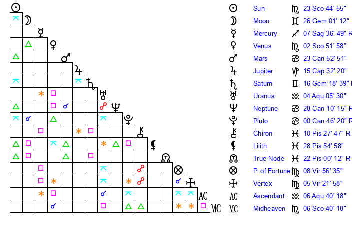 | Sun | 23 Scorpio 45 | 24 Scorpio 50 | 16 Pisces 17 |