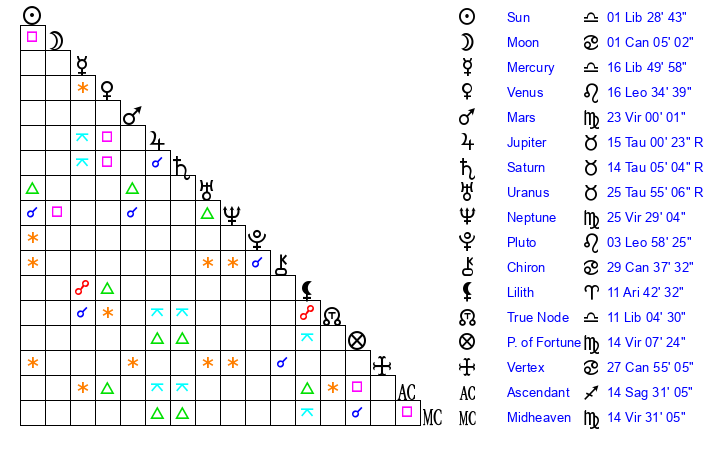 | Neptune | 25 Virgo 30 | 0 Aries 42 | 27 Virgo 40 |