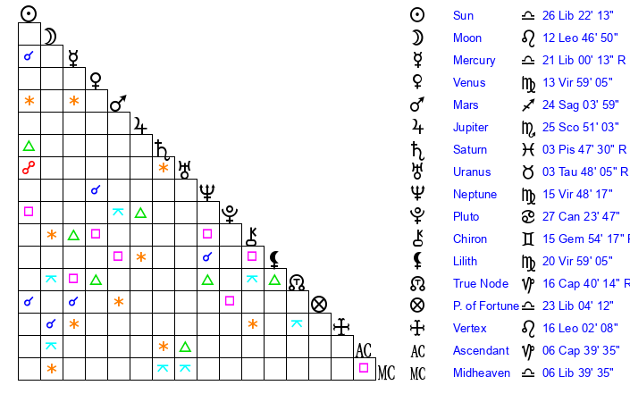 | Sun | 26 Libra 22 | 27 Libra 33 | 27 Capricorn 26 |