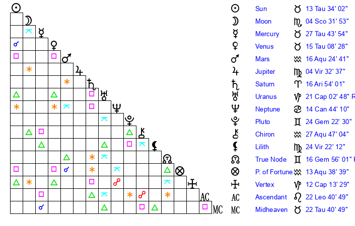 | Sun | 13 Taurus 34 | 14 Taurus 29 | 4 Virgo 43 |