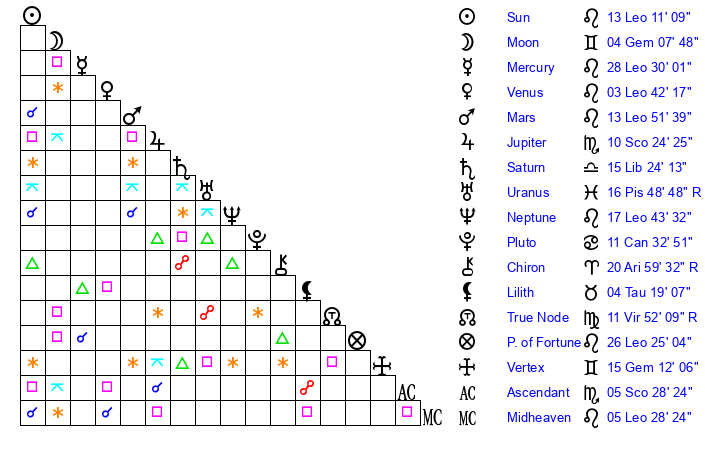 | Sun | 13 Leo 11 | 14 Leo 29 | 23 Scorpio 19 |