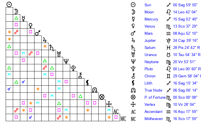 | Sun | 1 Sagittarius 0 | 1 Sagittarius 39 | 0 Pisces 24 |