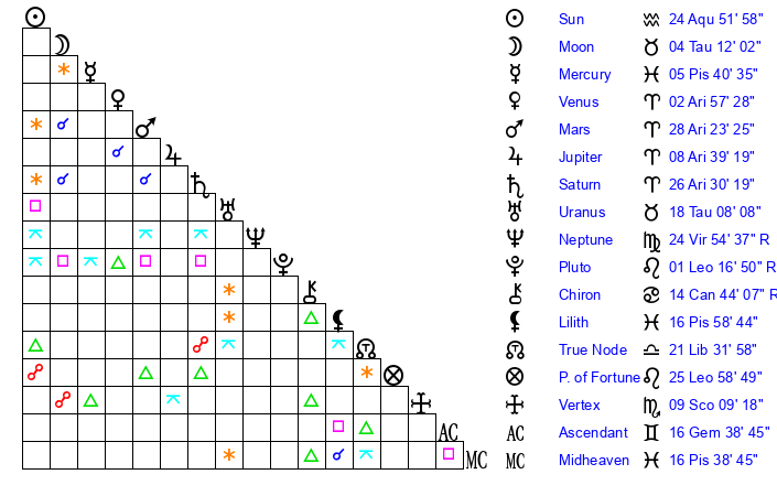 | Sun | 24 Aquarius 52 | 26 Aquarius 15 | 18 Taurus 54 |