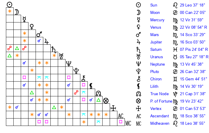 | Mercury | 12 Virgo 32 | 13 Leo 10 | 18 Scorpio 0 |