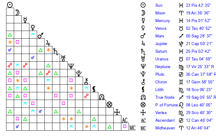 | Sun | 23 Pisces 42 | 24 Pisces 22 | 19 Gemini 22 |