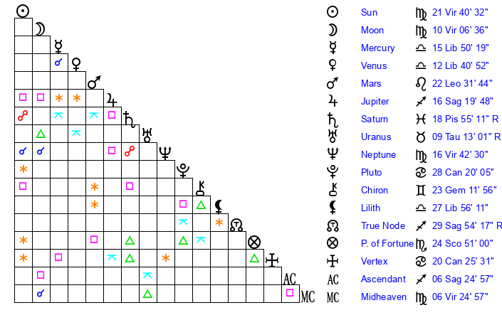 | Sun | 21 Virgo 40 | 22 Virgo 8 | 20 Sagittarius 31 |