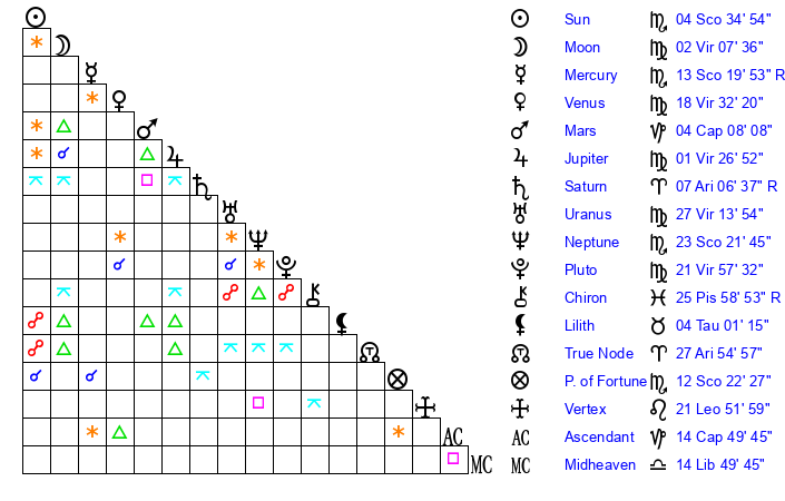 Neptune | 23 Scorpio 22 | 27 Pisces 33 | 25 Scorpio 25 |