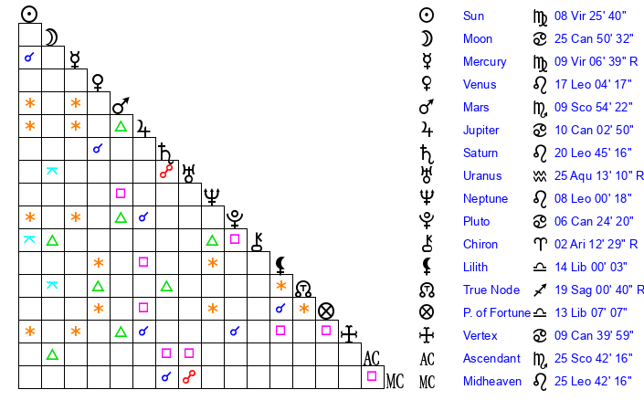 | Moon | 25 Cancer 43 | 25 Sagittarius 29 | 23 Gemini 44 |