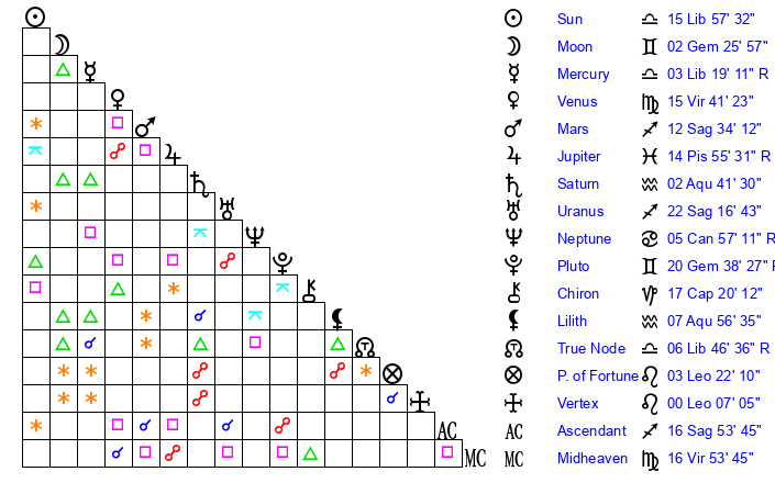 | Sun | 15 Libra 57 | 17 Libra 24 | 19 Aquarius 17 |